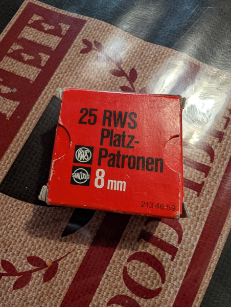 Verkaufe 25 Platzpatronen kal 8 mm . Der Firma rws. Siehe Bild
