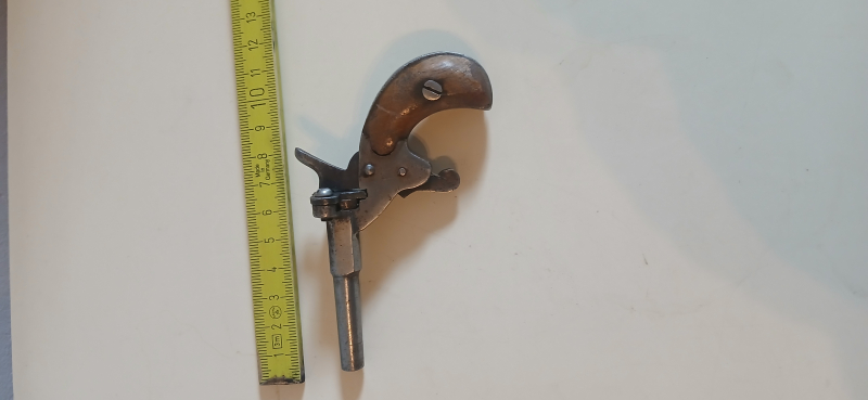 Bei dieser Pistole handelt es sich um eine einschüssige Schreckschusspistole im Kaliber 6 mm Flobert Platz mit Ausschuss nach oben, allgemein werden diese Ausführungen auch Startpistolen genannt. Diese Pistole ist vernickelt und hat Holzgriffschalen. Der Verschluss stammt von Mariette, einem Büchsenmacher aus Frankreich. Der Verschluss war für diese kleinen einschüssigen Pistolen gut zu gebrauchen, diese Version hat zusätzlich einen Hülsenausstoßer. Der Hahn lässt sich gut spannen und hat einen guten Federdruck. Diese Pistole wurde wohl auf Grund des Bekanntheitsgrades des scharfen Modells, als Schreckschusspistole Modell Radlerfreund gefertigt. Bekannt wurde die scharfe Version als sogenannte Radfahrer-Pistole im kleinen Kaliber 6 mm Flobert. Vor mittlerweile über 100 Jahren erfreute man sich daran, mit diesen Pistolen sportlich zu schießen.