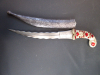 Aus meiner Sammlung gebe ich, ein alten Indischen Dolch mit Metallscheide gewellte Klinge Damast/Wootz? Griff weiße Jade ab. Griff weiße Jade mit Bizarren roten Glassteine in Messing gefast. Zweischneidige gewellte Damast/Wootz? Klinge, beidseitig am Ansatz Figürlichen Eisenschnitt mit starken Mittelgrad. Scheide Eisen mit Holzeinsatz, komplett mit Floralem Eisenschnitt, aber schon sehr Narbig. Sehr Aufwendig gearbeitetes Teil. Das Teil ist im Guten Sammelwürdigen Zustand, außer die Scheide. Alles andere entnehmen Sie Bitte den Fotos. Gesamtlänge: 45 cm, ohne Scheide: 42,5 cm, Klingenlänge: 29,3 cm, Klingenbreite: 4,6 cm. Kann zu jederzeit bei mir besichtigt werden. Privatauktion keine Rücknahme und Garantie.
