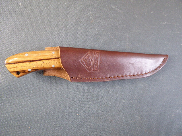 Aus meiner Sammlung gebe ich, ein Seltenes Puma Jagdmesser braune Lederscheide mit Logo Griff helle Holzschalen Herst. PUMA TEC ab. Griff zwei ausgesuchte helle Holzschalen mit 6 Nieten. Sehr Gut erhaltene Klinge einseitig mit Hersteller PUMA TEC und Nr. 31260. Braune Lederscheide mit PUMA TEC Logo geprägten mit Gürtelschlaufe. Das Teil ist im sehr Guten zu gebrauchenden und Sammelwürdigen Zustand. Alles andere entnehmen Sie Bitte den Fotos. Messer mit Scheide: 21,5 cm, ohne Scheide: 20,2 cm, Klingenlänge: 9 cm, Klingenbreite: 2,3 cm. Kann zu jederzeit bei mir besichtigt werden. Privatauktion keine Rücknahme und Garantie.