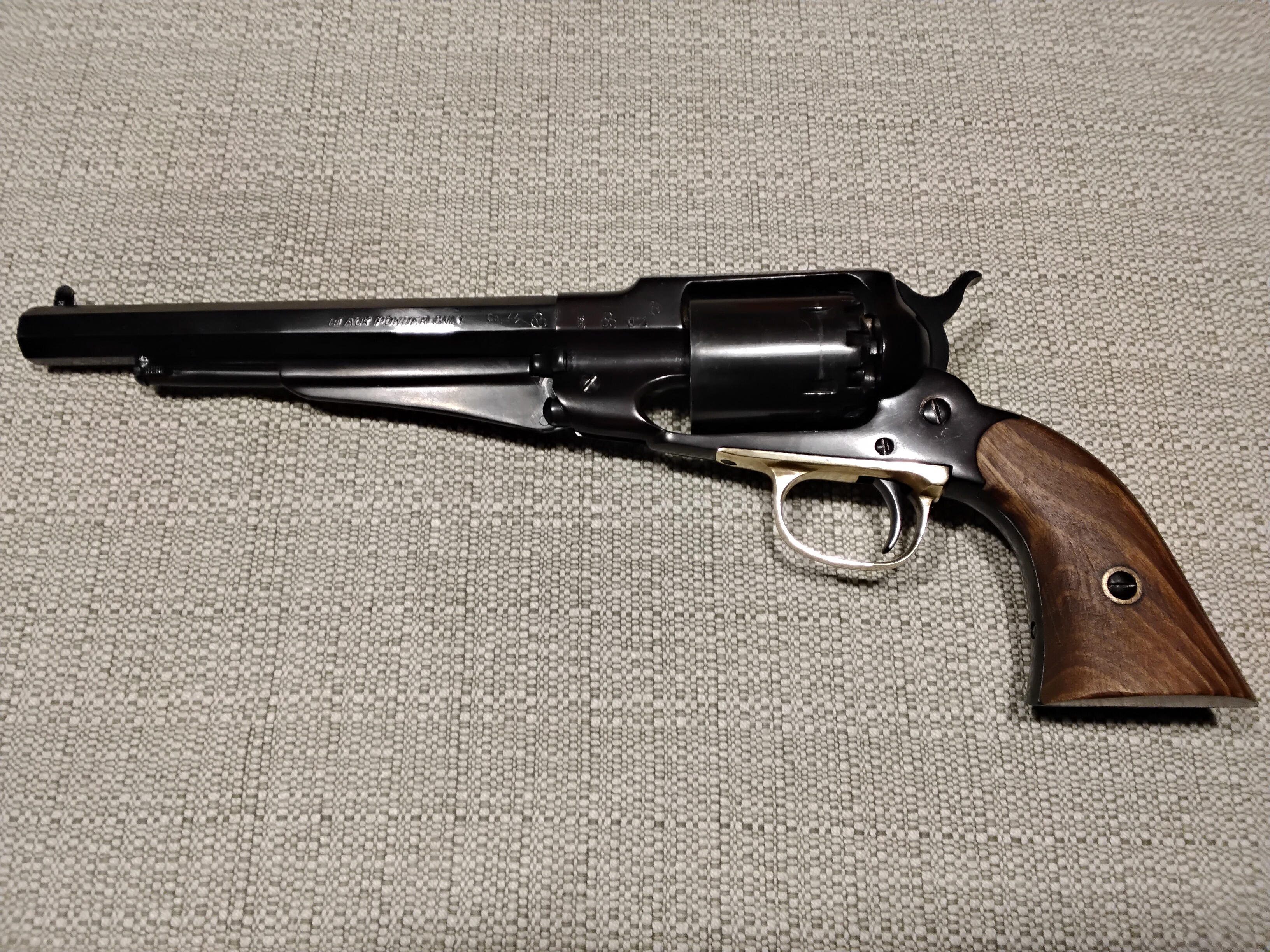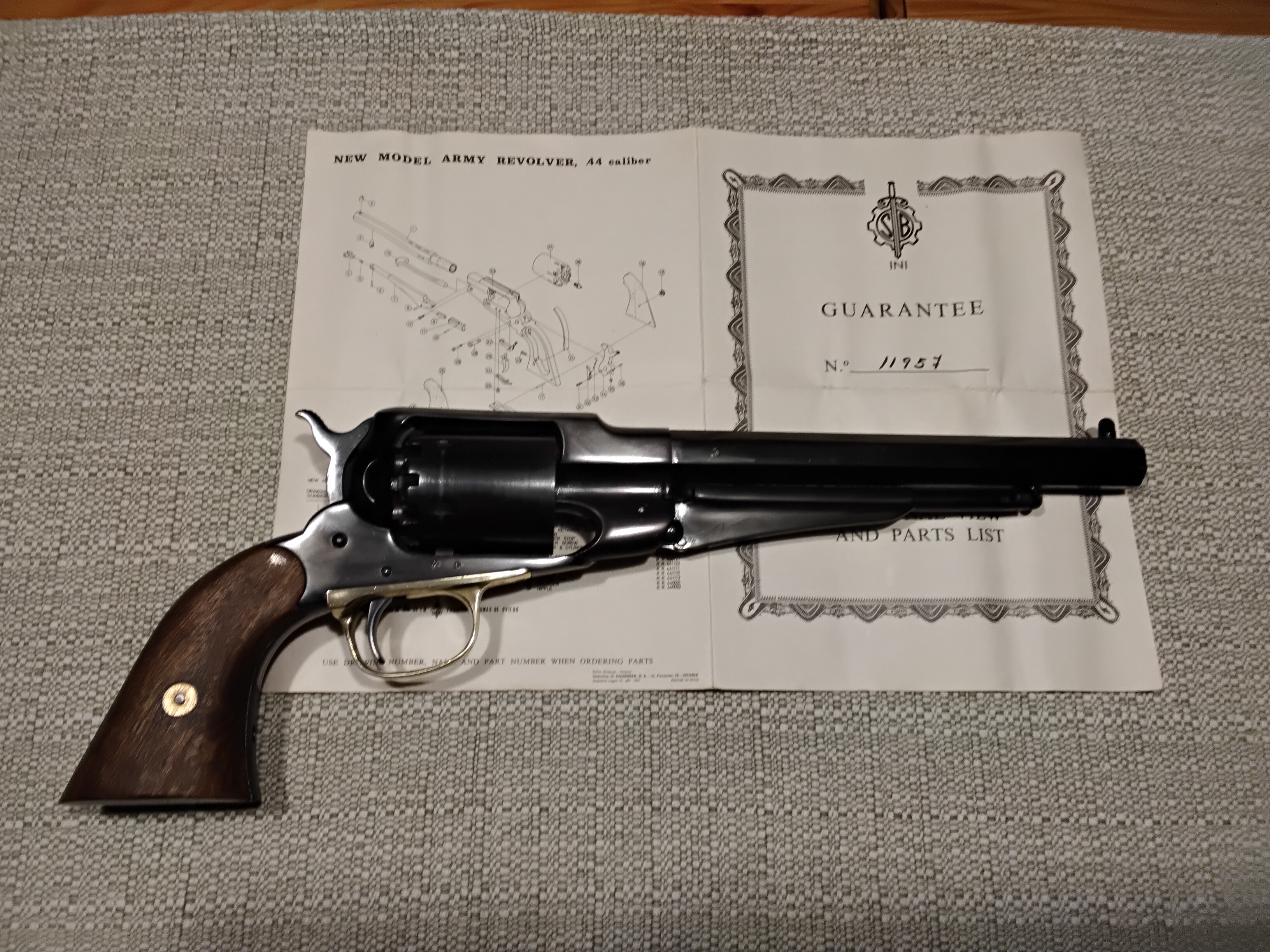 Santa Barbara Perkussionsrevolver. Mod. New Army, Kal. 44. Zustand 1-2 gepflegt. Schrankwaffe nach zwei Rundenkämpfen!