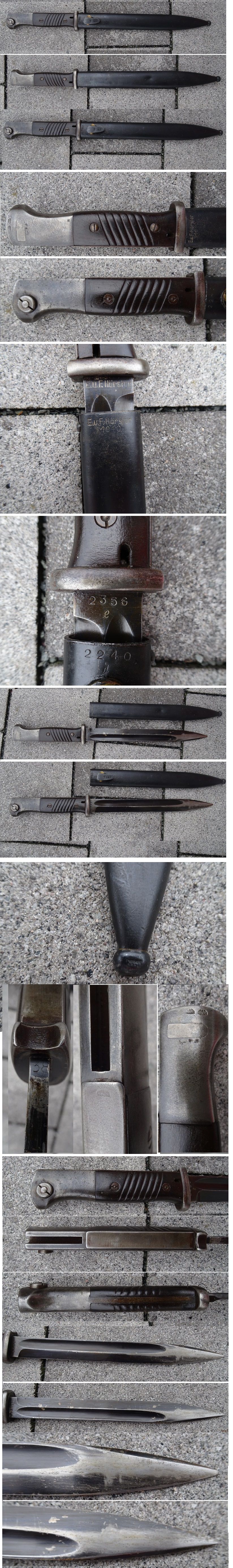 Zur Versteigerung kommt ein Bajonett für Karabiner 98er der deutschen Wehrmacht, (E. u F. Hörster), schöner, wenig gebrauchter Zustand. Die Klinge befindet sich in hervorragendem Zustand, ohne Scharten und Beschädigungen, noch mit schwarzer Brünierung, die Scheide ist später gefertigt. Alles Weitere entnehmen Sie bitte den Bildern. Verkauf aus Ankauf ,Erbschaft oder Komission. wird das Garantie- u. Rückgaberecht für diesen ausgeschlossen. Käufer trägt Versandkostenpauschale von 10,00 Euro. Vorbesichtigung nach Absprache erwünscht. Korospontenz und Versand nur Freitag, Samstag und Sonntag. Firma Vogel GbR, Waffenhandel, Oberschweinach 1, 91413 Neustadt.