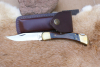 Backlock/Rückenverriegelung. Klingenlänge ca 95 mm Gesamtlänge etwa 215 mm Gewicht etwa 204 gr. Gürteltasche aus Leder, hinten 110 gestempelt, Druckknopf umlaufend mit Buck gestempelt.