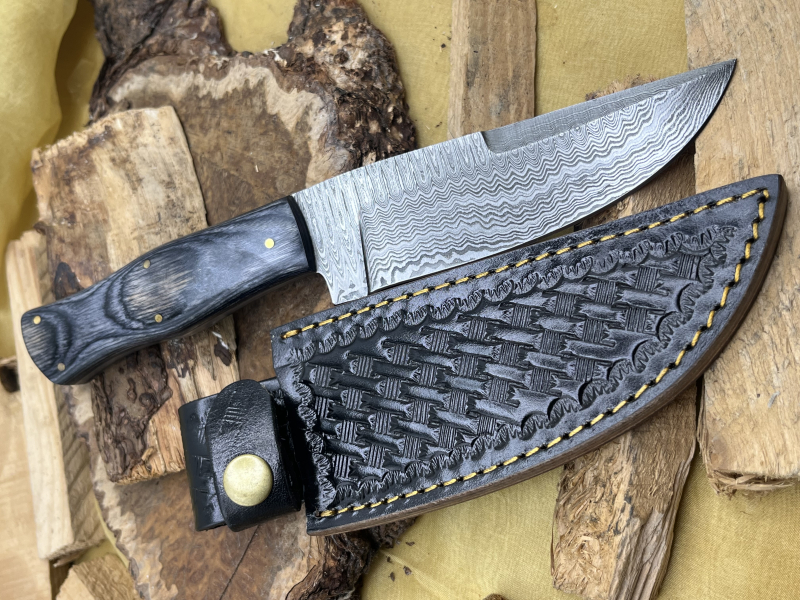 Typ: Handgefertigtes Damast-Jagdmesser aus über 200 Lagen. Holzgriff. Inklusive Lederscheide.