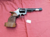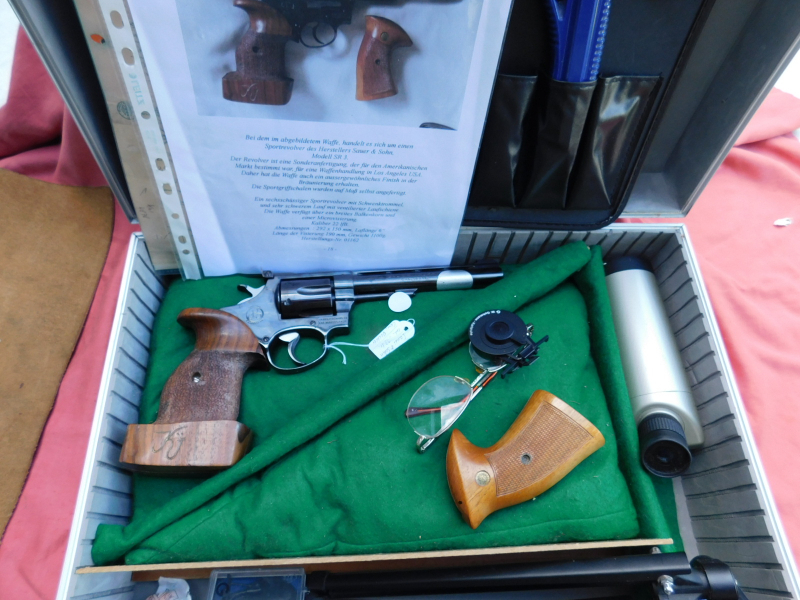 Sportrevolver Sauer & Sohn Modell SR 3 Kal. 22 LR. Der Revolver ist eine Sonderanfertgung, der für den Amerikanischen Markt bestimmt war, für eine Waffenhandlung in Los Angeles USA. Daher hat die Waffe auch ein aussergewöhnliches Finish in der Bräunierung erhalten. Die Sportgriffschalen wurden auf Maß selbst angefertigt. (sehr klein, ca. Handgröße 7) Es ist ein sechsschüssiger Revolver mit Schwenktrommel, schwerer Lauf mit Laufschiene. Die Waffe verfügt über ein breites Balkenkorn und Microvisierung. Kal. 22 Lr.