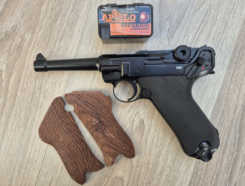 Dazu lege ich eine volle Dose Apollo BB's bei sowie neue P08 Holzgriffschalen (müssen vor Montage jedoch noch angepasst werden!) bei.