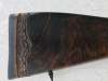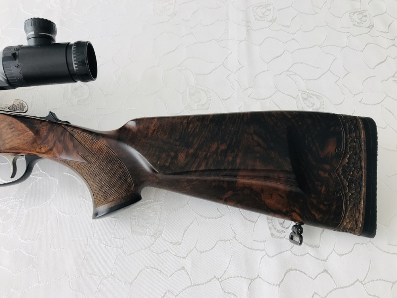 Es handelt sich um eine Sonderausführung mit einer sehr ansprechenden floralen Ornamentgravur auf grauem System. Der dunkle Maserholzschaft (mind. HK 8) verfügt über eine dezente Verschneidung vor der Schaftkappe und einen Ebenholzabschluss am Vorderschaft. Die Schaftlänge (LOP) beträgt 35 cm.