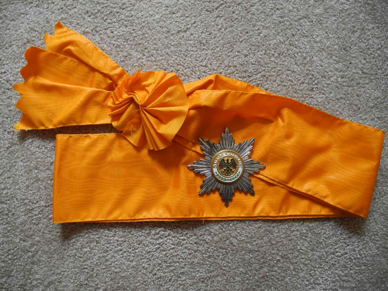 Versteigere preuss. Schwarzer Adler-Orden (Repl. v. Göde - auf der Rückseite sind Klebereste) und die dazugehörige preuss. Schärpe in orange. (doppelt genäht)