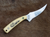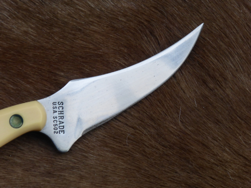 Sie bieten auf ein SCHRADE U.S.A. Jagdmesser mit Scrimshaw auf dem Griff. In diesem Fall zeigt das Scrimshaw einen röhrenden Hirschen. Die Klinge hat eine Skinner Form. Der Griff liegt gut in der Hand. Die Gesamtlänge beträgt ca. 18 cm, auf die Klinge entfallen ca. 8,50 cm. Klingendicke ca. 3,5 mm.