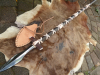 Der ausgesuchte, achteckige Wieseneschen Schaft ist sehr schön gemasert. Er wurde antik Farben gebeizt und mehrfach geölt. Die Wicklung besteht aus Kernleder und wurde mit handgeschmiedeten Pyramiden Kopf Nägeln befestigt. Der echte, rechteckige Hirschhornknebel ist in der Oberflächen Struktur körnig und insofern eine Seltenheit und farblich passend zum dunklen Schaft.