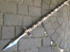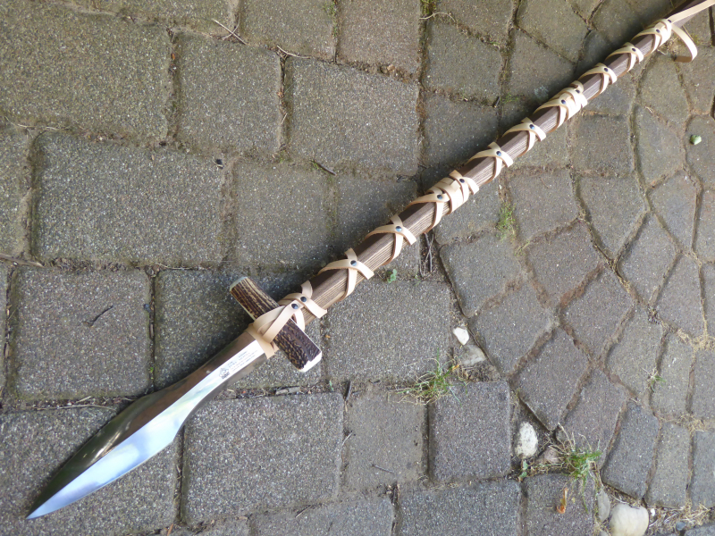 Der ausgesuchte, achteckige Wieseneschen Schaft ist sehr schön gemasert. Er wurde antik Farben gebeizt und mehrfach geölt. Die Wicklung besteht aus Kernleder und wurde mit handgeschmiedeten Pyramiden Kopf Nägeln befestigt.