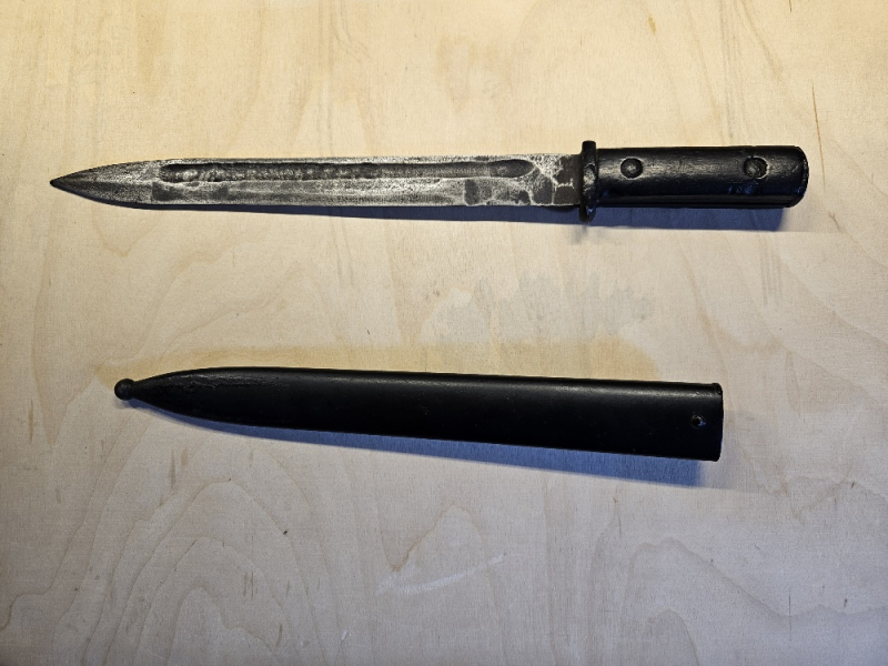 Länge gesamt 35 cm, Länge Klinge 25 cm, Breite 3,5 cm. Holzgriff und Scheide geschwärzt. Keine Halterung für Gewehr vorhanden und keinerlei Beschriftungen oder Stempel sichtbar. Wurde offensichtlich schon mal drauf rum gedengelt. Zustand siehe Bilder, Privatverkauf, daher keine Garantie oder Rücknahme.