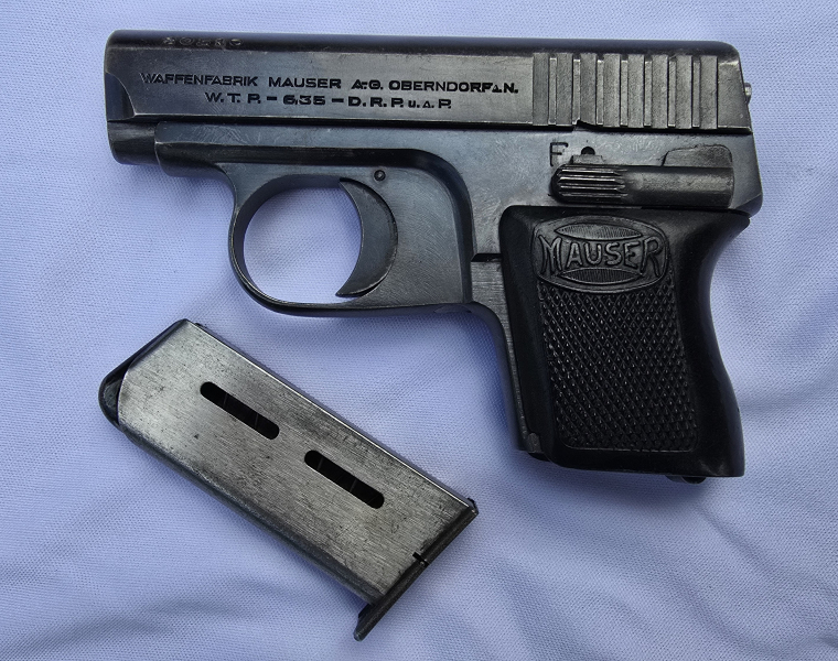 Allgemeine Infos: Nach dem großen Erfolg der ersten Taschenpistolenmodelle im Kaliber 6,35mm ließ sich Mauser noch im Jahre 1918 ein deutlich kleineres Westentaschenmodell patentieren.
