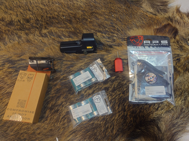 Dazu lege ich noch einen defekten Eotech Clon von Strike Systems, den man sich als Deko darzulegen / montieren kann.