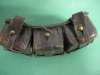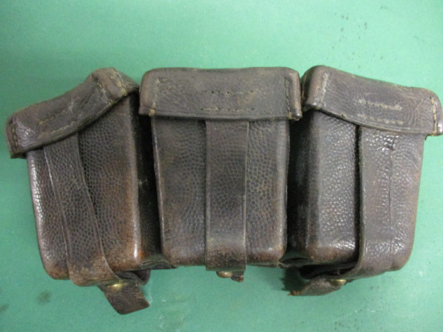 Angeboten wird eine gut erhaltene Patronentasche für das G 98 ,1.Wk. .Die Rückseite noch braun ,die Vorderseite geschwärzt .Frühe Fertigung , Messingbeschläge . Nähte fest , innen mit Stegen .Eine Lasche an der Spitze beschädigt , s.Bild