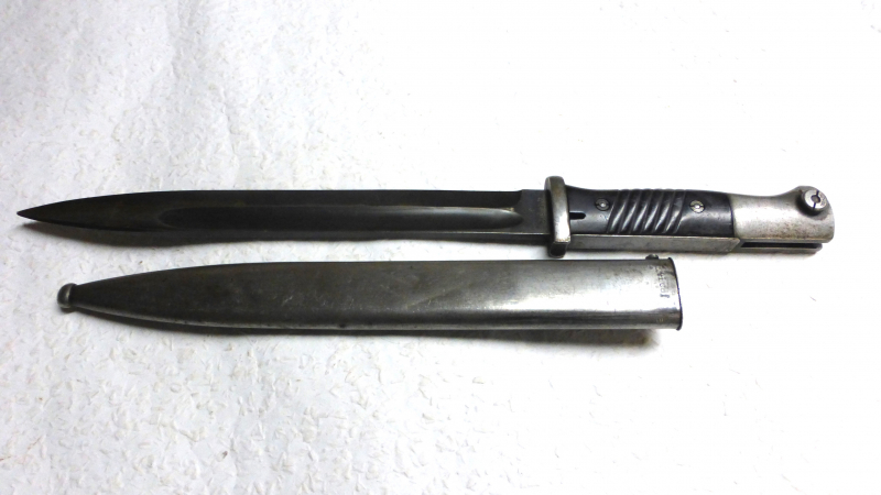 Sie bieten auf ein original Bajonett zum K98. Bakelit-Griffschalen, geschraubt. Bajonett und Scheide nummerngleich. Nummer=4592d gestempelt, beides auch cof41=Hersteller Eickhorn, Carl, Waffenfabrik Solingen. Insgesamt 4x WaA Stempel, 2x Griff 1x Drücker 1x Scheidenspitze. Die Brünierung der Klinge ist noch gut erhalten. Insgesamt sehr schöner Zustand. Drücker beweglich, Feder ok. Unbefummelter Fundzustand. Die Scheide könnte man nachbrünieren, ich habe es aber lieber so belassen. Gesamtlänge 40,5cm - Gewicht 575g - Altersnachweis wird verlangt! Dieses ist ein Privatverkauf, keine Garantie oder Rücknahme.