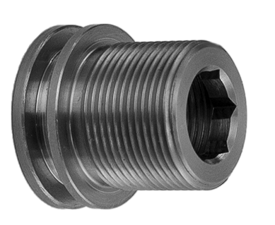 Gewindeteil mit Kombi-Mündungsbremse aus Edelstahl 1.4305. Zusätzlich sind die Kammern mit Edelstahl-Ringen verstärkt.