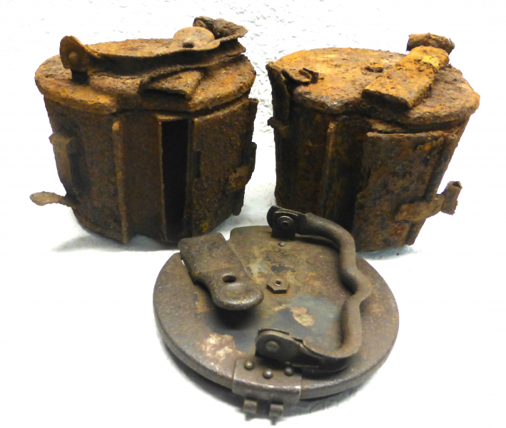 Sie bieten auf 2 Gurttrommeln aus Bodenfund, im grob gereinigten Fundzustand. Dabei ist ein Deckel, Scheunenfund mit Restfarbe, wohl Luftwaffe? Am Deckel alles beweglich, Federn ok. Keine Garantie! Belegstück oder Bastelobjekt. Dieses ist ein Privatverkauf, keine Garantie oder Rücknahme.