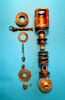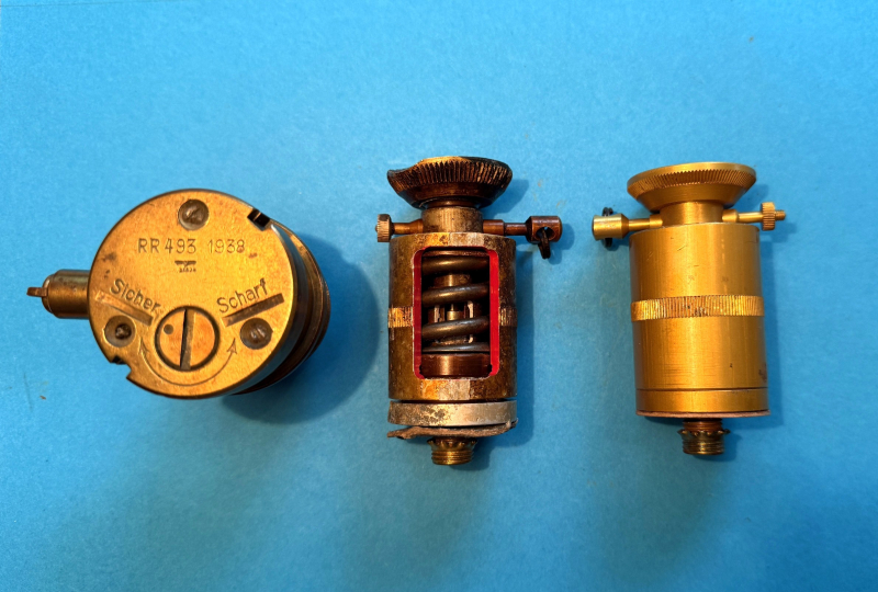 Der Aluminium- Druckzünder 35 ist mir einer Druckfeder versehen, die bei einer Auslösekraft von 60kg nachgibt. Der Zünder ist über einen Sicherungsbolzen im oberen Teil der Schlagbolzenhülse gesichert. Wurde über die Druckkappe die Schlagbolzenhülse nach unten gedrückt, konnten die zwei Sperrkugeln über ihre Bohrung nach außen an den schmäleren Durchmesser des Gleitrings entweichen. Der vorgespannte Schlagbolzen war frei und konnte auf das Zündhütchen schnellen. Das Schnittmodell ist voll funktionsfähig. Der mechanische Ablauf im Inneren kann beim Auslösen erklärt und beobachtet werden. Das Zünder Gehäuse ist gestempelt: RR 401-37 (Richard Rinkler GmbH, Herstellungsjahr (19)37)