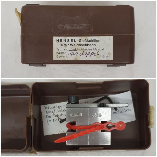 Hensel Gießkokille Kaliber 464 Doppelkokille. Die Kokille ist neu und unbenutzt und stammt aus seiner Sammlung. Ich habe die Bilder so gut es geht gemacht das sie sich einen eigenes Bild vom Zustand machen können. Fragen beantworte ich gerne, einfach schreiben.