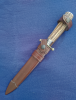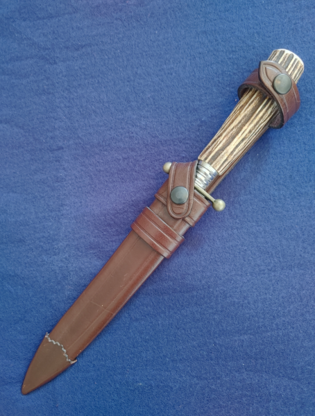 Die Klinge ist ca. 15,5 cm lang, der Dolch ca. 27 cm - die Klinge wurde niemals nachgeschliffen, mit Lederscheide, Horngriff. Zustand s. Fotos.