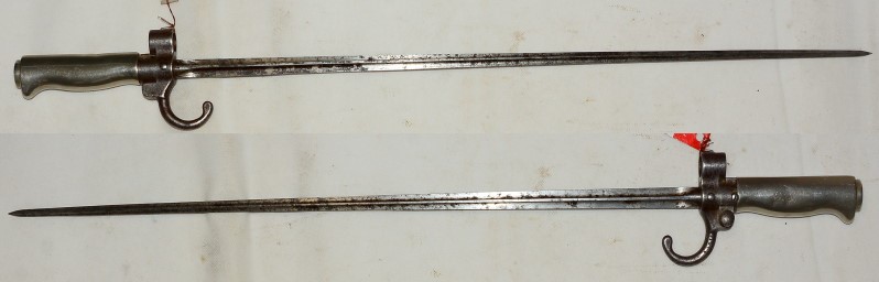 Französisches Lebel Bajonett Mle 1886, 55 cm Klingenlänge,4-Kant-Klinge, noch mit Parierhaken, Eisenmetall rostfleckig, keine Scheide