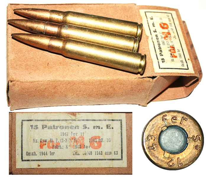Sie bieten auf ein seltenes Päckchen mit 15 Stück 7,9 Mauserpatronen der Wehrmacht aus dem 2. Weltkrieg. Die Patronen haben noch eine Messinghülse und sind aber mit einem S.m.E Geschoss ( Spitzgeschoß mit Eisenkern ) geladen. Hergestellt 1943 von fer ( Metallwerke Wandhofen GmbH, Schwerte / Ruhr, Westfalen ). Das Etikett trägt den roten Tintenstempel " Für MG " Weiteres siehe Fotos, sie zeigen das Päckchen aus dieser Auktion. Die Patronen können auch durch Ziehen der Geschosse und Entfernen des Pulvers delaboriert werden. Nach Einlegen einer „Klapperkugel“ und Ölen des Zündhütchens wird das Geschoss wieder gesetzt. Dann frei ab 18 Jahre. Privatverkauf aus Sammlungsauflösung