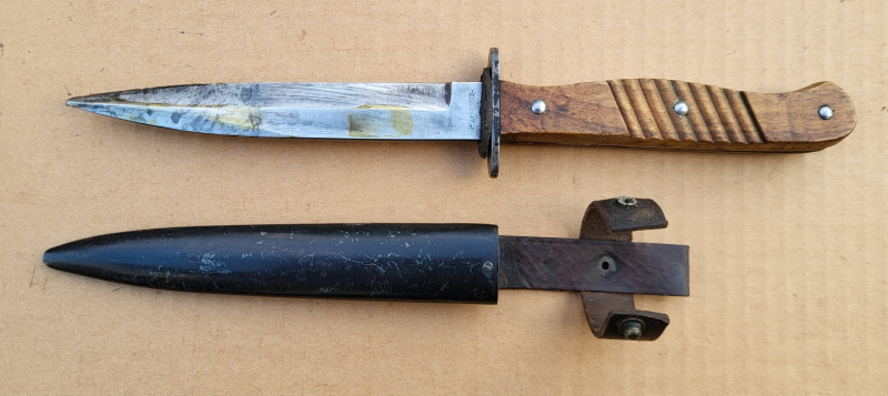 Grabendolch des Herstellers ERN Rasiermesserfabrik mit Abnahmestempel. Klingenlänge: 146mm, Gesamtlänge: 275mm, Scheide mit originaler Lackierung, Druckknopf der Griffschlaufe beschädigt, siehe auch Bilder! Beschreibung erfolgt nach bestem Wissen und Gewissen. Bilder sind Teil der Beschreibung. Keine Gewährleistung nach EU-Recht.