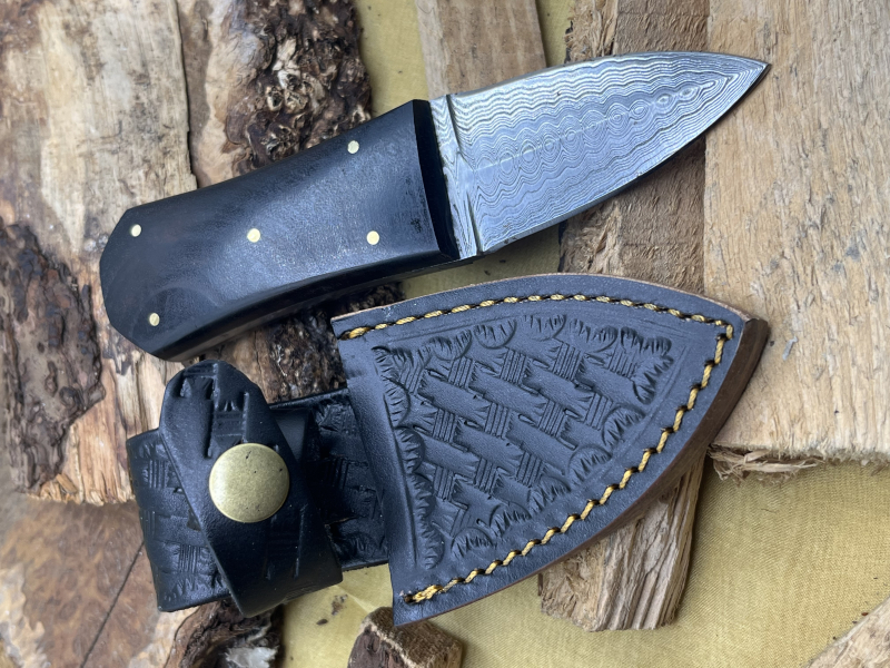 Typ: Handgefertigtes Damast-Dolchmesser (doppelschneidig) aus über 200 Lagen. Volle Erl-Damastklinge. Holzgriff. Inklusive Lederscheide.