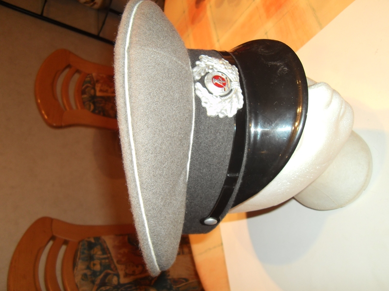 ORIGINAL NVA SCHIRMMÜTZE, Größe 60, grau, Landstreitkräfte. Im Innenbereich der Mütze auf einer ledernen Raute eingeprägt oben NVA darunter 60, in der unteren Hälfte 1856 und darunter H. Innen Schweißband aus Leder, ist etwas wellig. An der Front der Mütze Eichenkranz mit Hammer & Zirkel. Im Innenbereich Name des ursprünglichen Trägers.