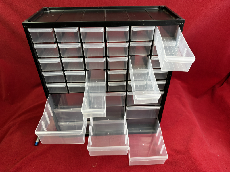 Es handelt sich hier um einen schönen Sortiment Kasten mit verschieden großen Fächern aus bruchfestem Kunststoff.