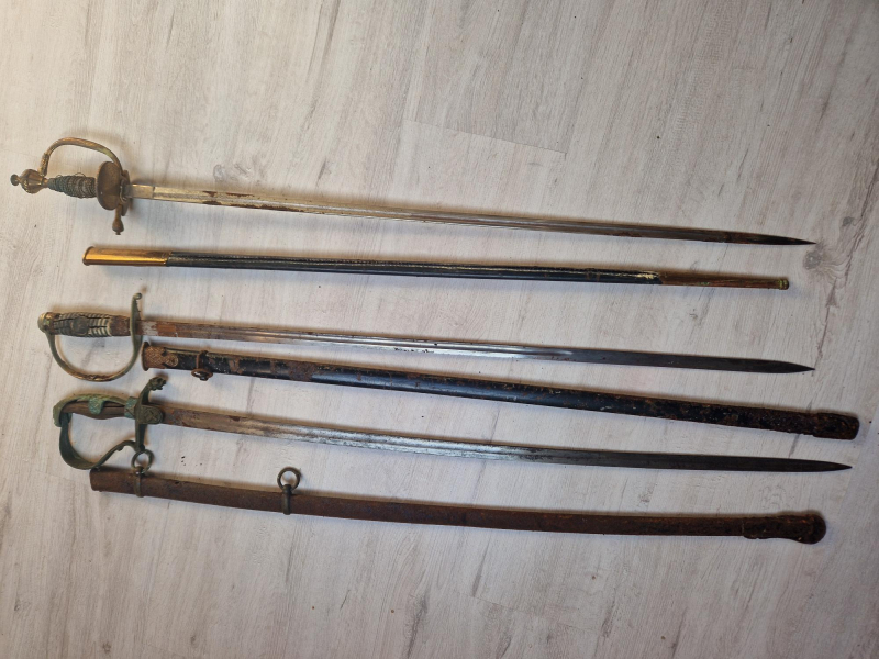 Sie bieten hier auf drei Säbel aus einem Dachbodenfund bzw. Nachlass. (Zustand siehe Bilder) Die Scheide des unteren Säbels ist stark verrostet. Der obere hat unter dem Griffstück die Stempelung "Eickhorn Solingen" ) Pers. Besichtigung oder Abholung ist nach Absprache möglich. Verkauf nach EU-Recht ohne Garantie, Umtausch oder Nachverhandlungen. Weitere Bilder gerne auf Anfrage.