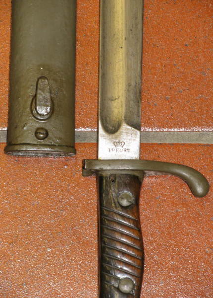 Zum Verkauf kommt ein Bajonett Deutsch, ein Bajonett / Seitengewehr SG 98/05 mit Scheide und Krone ERFURT / 09