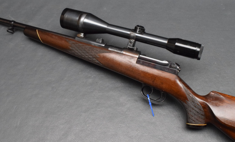 Nußbaumschaft mit bayrischer Backe, Edelholzabschlüssen, Kunststoffschaftkappe und Riemenbügeln.