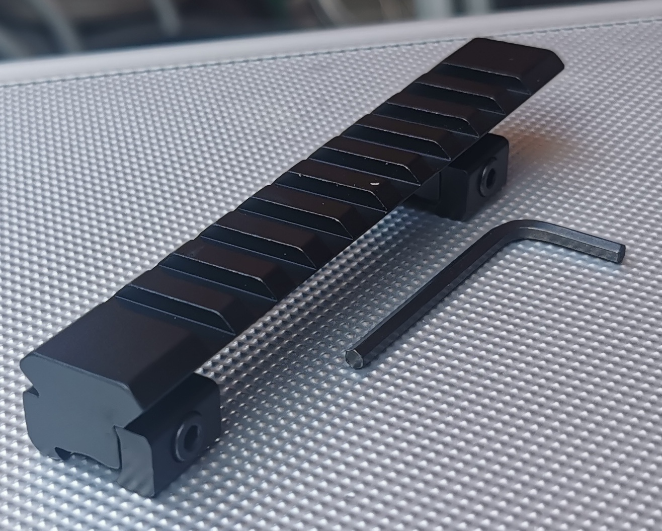 Von Picatinny 11 mm zu Weaver-Montageschiene. Bauhöhe beträgt 13mm. Weaverschiene Länge 124mm. Material: Flugzeugaluminium. Trägt nicht massiv/schwer auf. Schussfest. Neu