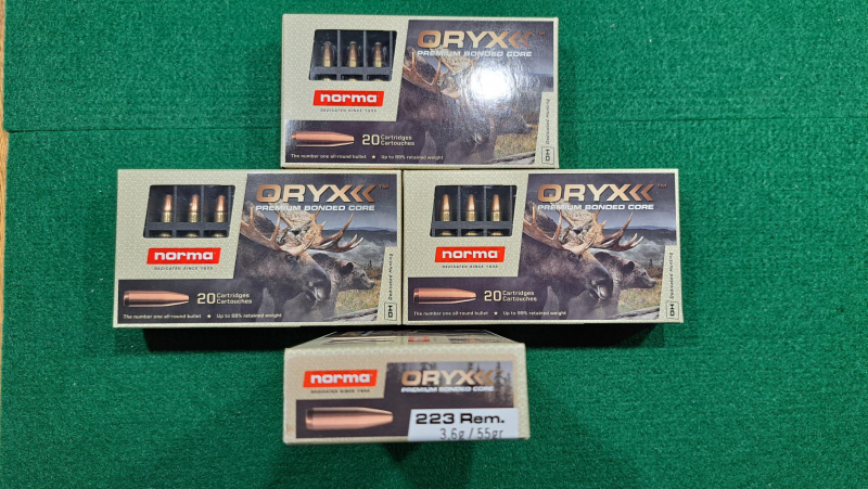 4 x 20 Stück = 80 Schuss NORMA Oryx .223 Rem. 3,6 gr,/ 55grs ....80 Stück .... NEU in ungeöffneter OVP; Preis gilt für die gesamten 80 Schuss (sind aus einem Los)Es gilt: Privatverkauf ohne Gewährleistung, Garantie oder Rücknahme