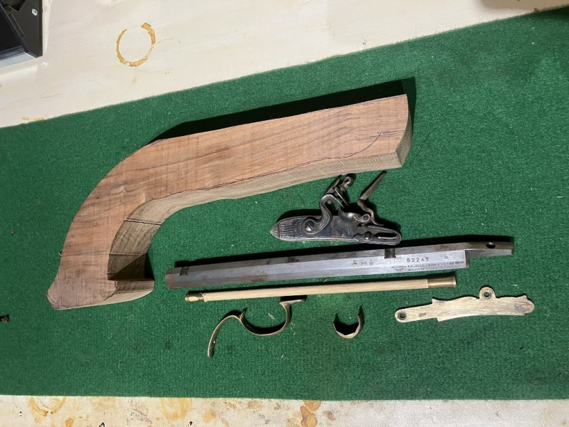 Ich biete hier aus einem Nachlass einen offenbar unvollständigen Bausatz einer Steinschloss Vorderlader Pistole an.