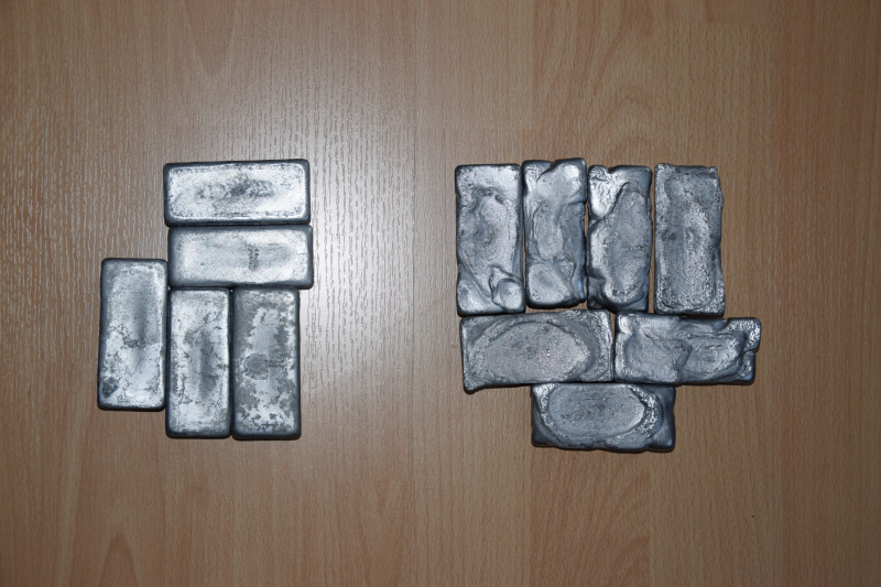 Verkaufe aus Nachlass: ca. 5,0 kg Geschossblei mit insges. 12 Bleibarren (1,8 kg Legieru8ngsblei -5 Bleibarren- und 3,2 kg Hartblei -7 Bleibarren-). Das Geschossblei ist in handlichen Barren gegossen. Es ist kein Schießstandblei bei dem Hartblei oder "gestreckte" Lettern bei dem Letternmetall/Legierungs-blei. Aufgrund meines Tests mit dem Härteprüfer von Bischof müßte der Härtegrad bei dem Legierungsblei über 20 Brinellhärte und das Hartblei bei ca. 15-16 Brinellhärte liegen. Gemäss Literatur setzt sich das Letternmetall aus Blei, ca. 5 bis 6 % Zinn und ca. 28 - 29 % Antimon zusammen.