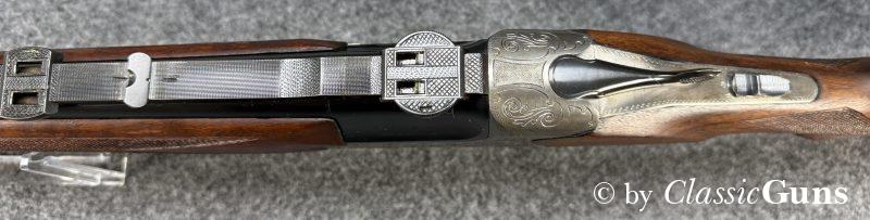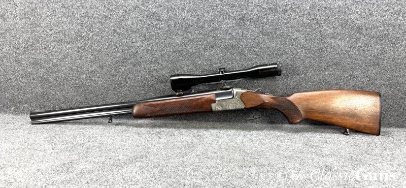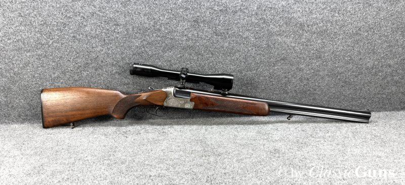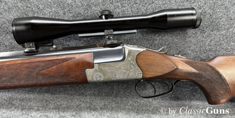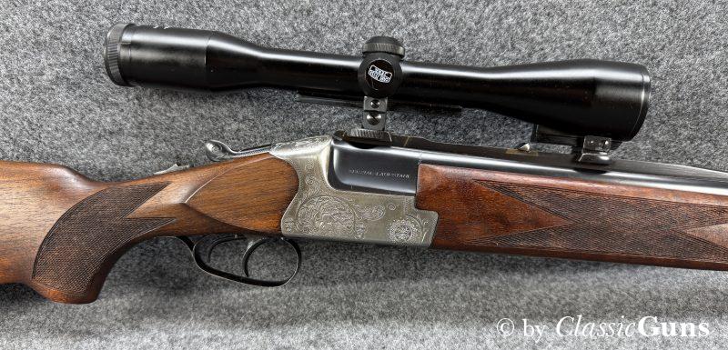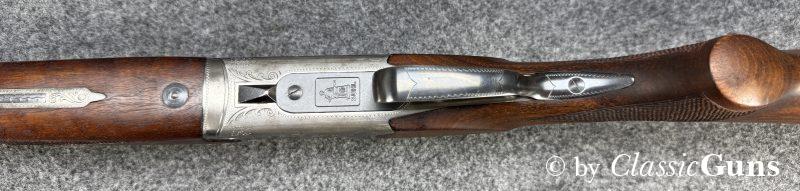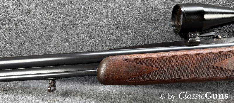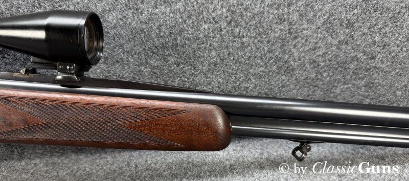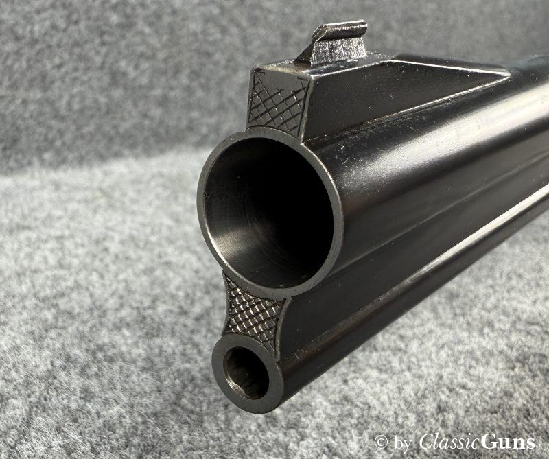 630 mm langes Laufbündel, der Schrotlauf spiegelblank und der Kugellauf mit neuwertigem Zug-/ Feldprofil. Sehr schöner Nussbaumschaft, sehr gut erhaltene Brünierung, automatische Sicherung und der Abzug für den Kugellauf mit Rückstecher.