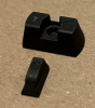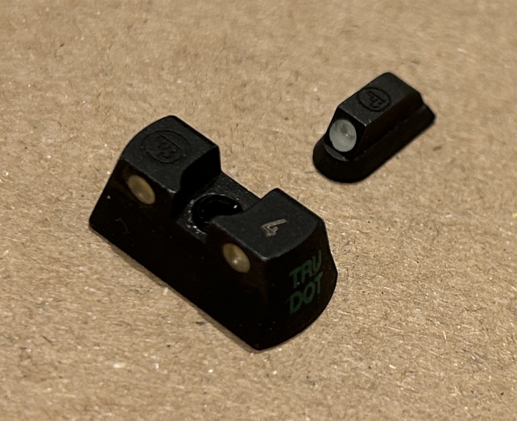 Eine stählerne Visierung Kimme und Korn für Pistolen CZ75B original CZ (Prägestempel) in der Ausführung mit (altersbedingt inzwischen schwächer) nachleuchtender TRU DOT Punkte. Unmontiert, die weissen Punkte sind tagsüber sowieso einwandfrei erkennbar und in Dunkelheit ständig schwach glimmend. Korn in der Ausführung für verstiftete Schwalbenschwanzführung.