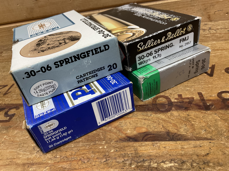 Konvolut Munition neuwertig in original Verpackung im Kal..30-06, 20 Patronen von PMP Soft Point 220gr., 8 Patronen PMP Soft Point 180gr., 14 Patronen S&B SP180gr, 6 Patronen S&B FMJ 180gr., Zustand und Menge siehe Bilder!!!