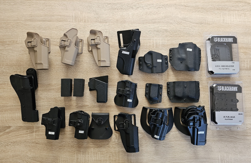 Zum Verkauf steht ein Konvolut aus verschiedenen Hartschalen- und Kydexholstern und Magazinhaltern. Darunter Marken wie BLACKHAWK! und Fobus, passend unter anderem für PPQ, P99, S&W 686, Sig P320, 1911er, Glock und Beretta Modelle.