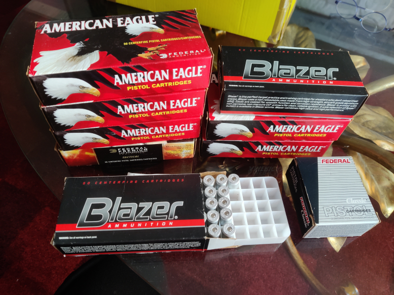 Ich habe meine Waffe verkauft und nun einen bunten Strauß .45 ACP abzugeben. Insgesamt etwa noch 400 Patronen, drei, vier Jahre alt. Die meisten VM American Eagle und ca. 100x Hohlspitz zweierlei Fabrikate. Versand ist möglich, am liebsten wären mir Abholer. Selbstverständlich nur gegen Berechtigte, das wird geprüft. Fragen jederzeit, Rest den Fotos entnehmen.