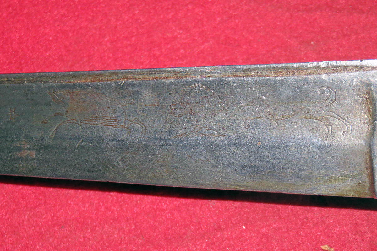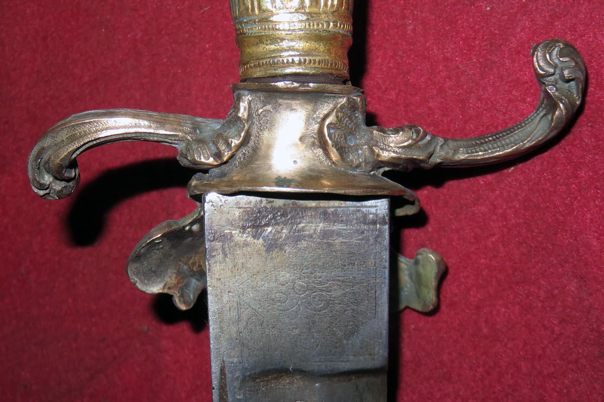 Der aus einer Jagdsammlung stammende Hirschfänger hat einen mit Restgold versehenen Messinggriff und eine gerade Klinge mit jagdlicher Ätzung.
