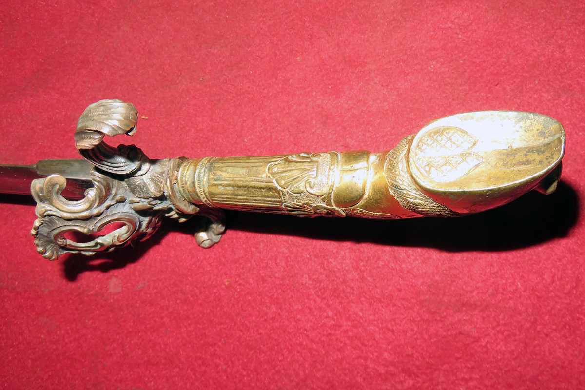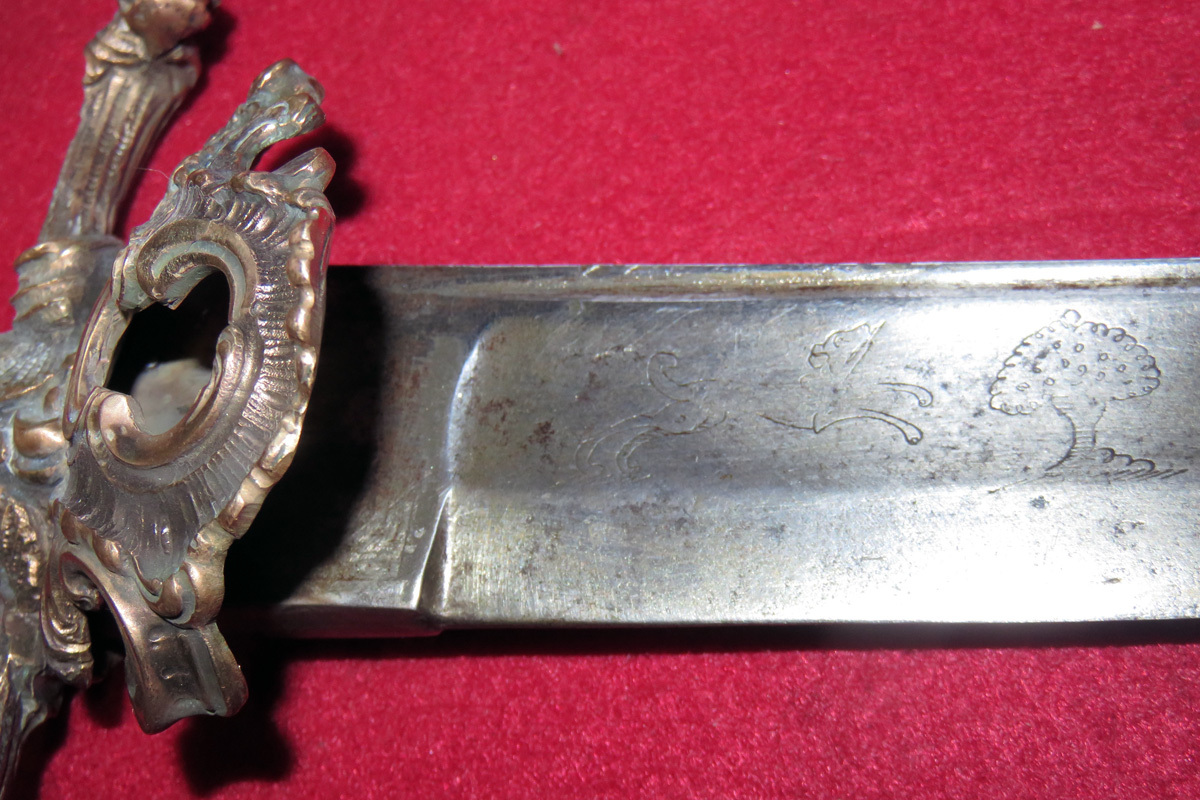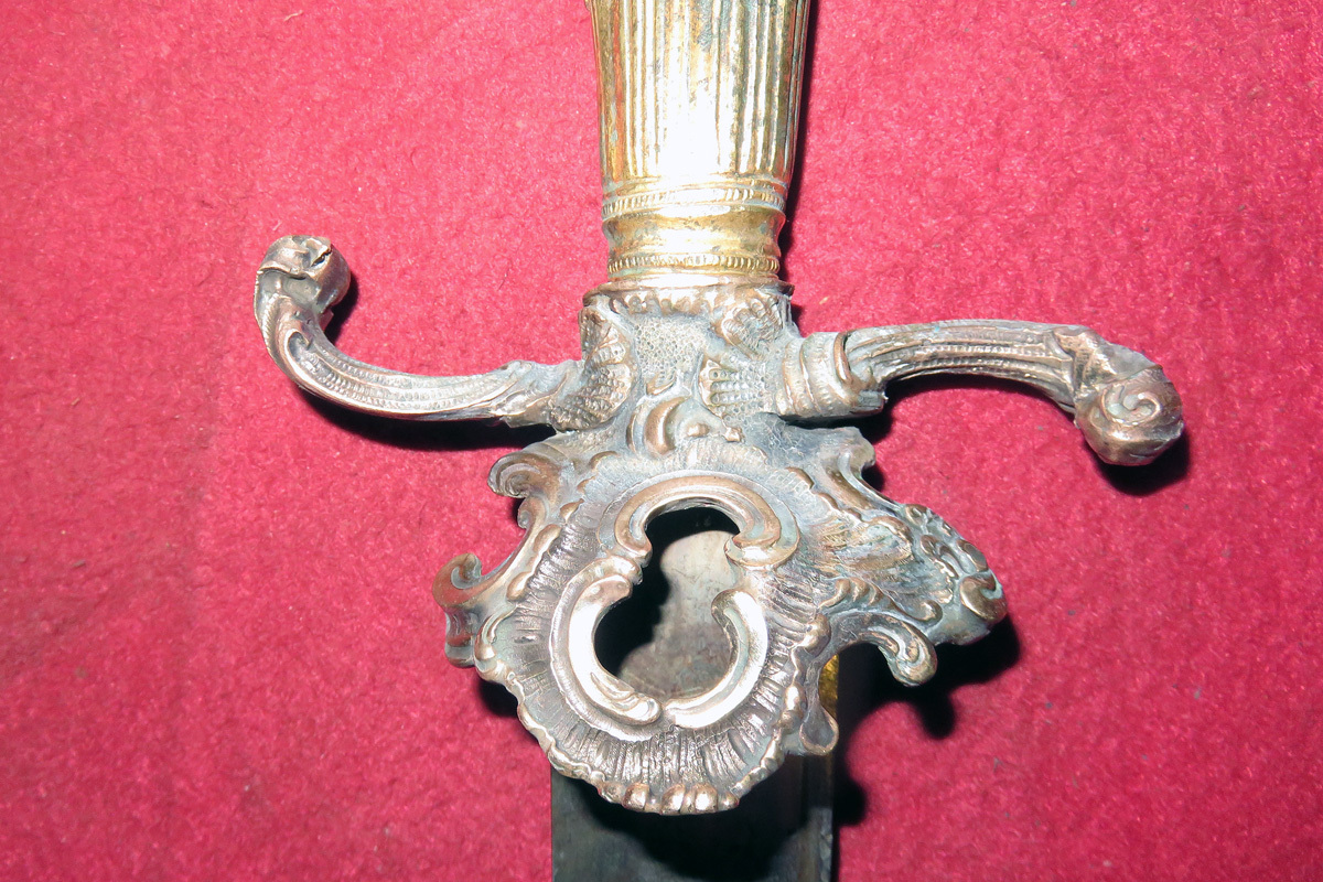 Der Griff ist ausgefallen gestaltet, mit Rehhuf Motiv und durchbrochener Rokoko-Muschel mit Restvergoldung.