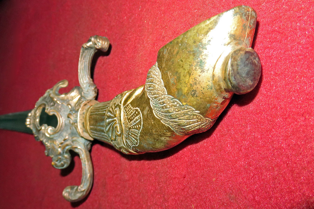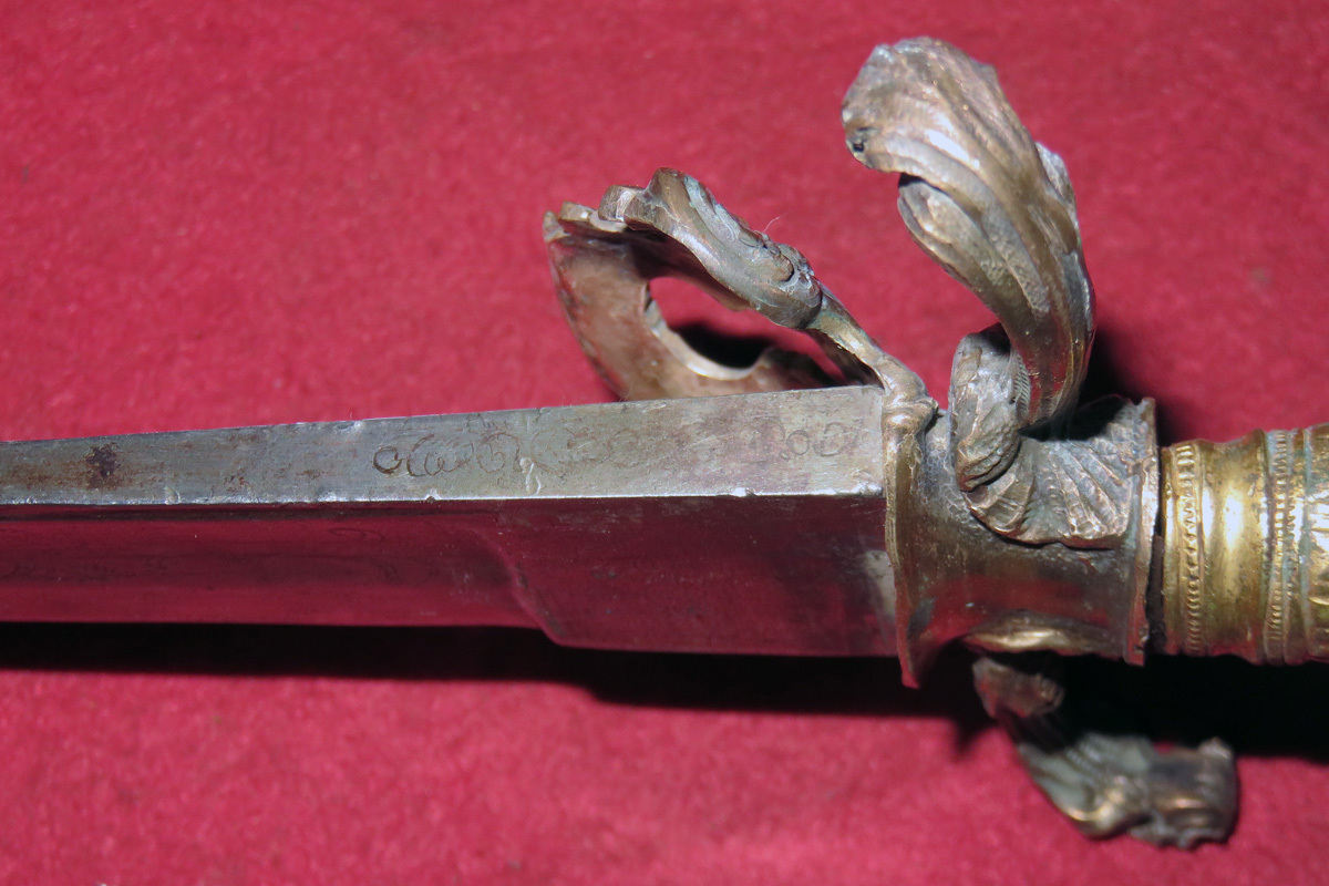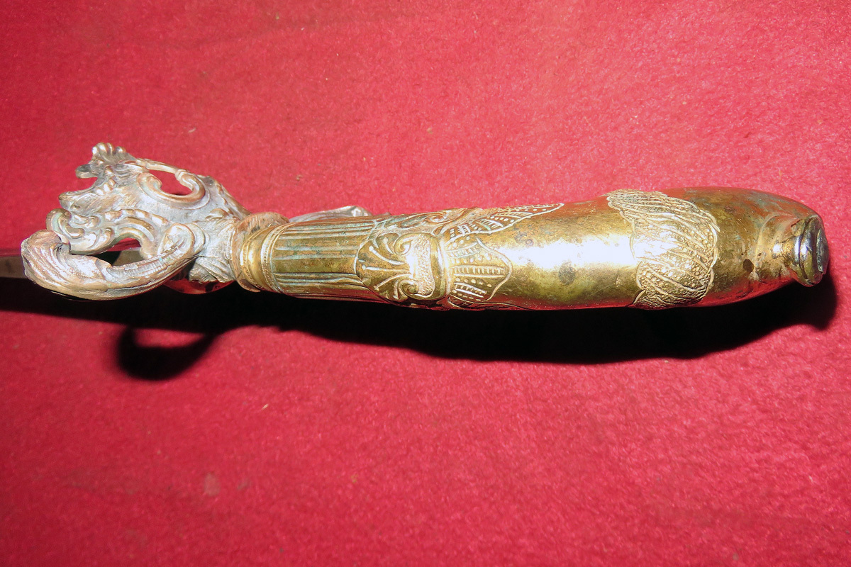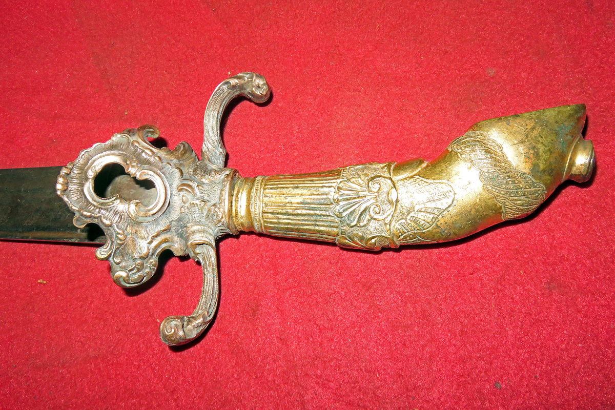 Der Griff ist ausgefallen gestaltet, mit Rehhuf Motiv und durchbrochener Rokoko-Muschel mit Restvergoldung.