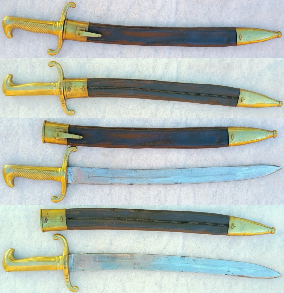 Gut erhaltenes Seitengewehr UM 1864 mit Lederscheide. Truppenstempel nicht nummerngleich. Parierstange: I.M. II.7.13., Scheide: 40.A.6.15. Abnahmepunzen, gelöschter Truppenstempel und überstempelt, Klinge angeschliffen Hersteller nicht erkennbar.