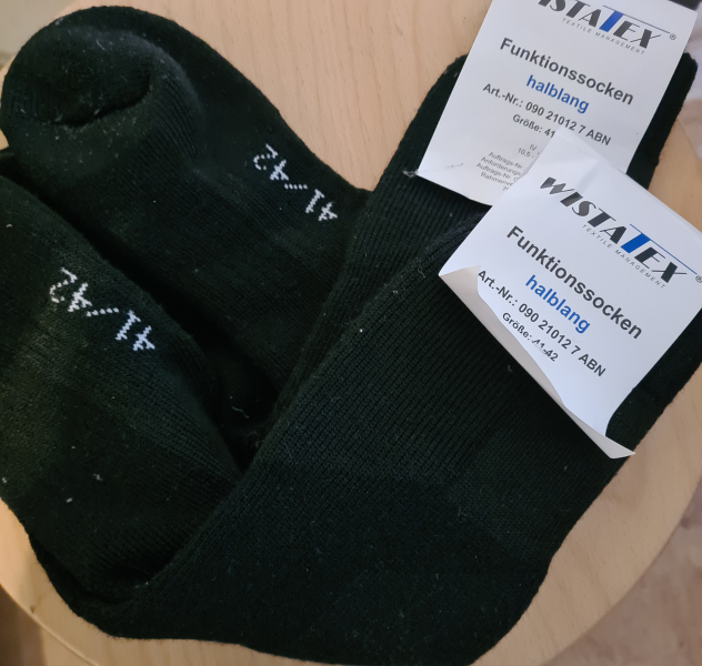 Zum Verkauf stehen zwei Paar Funktionssocken der Bundeswehr. Diese sind neu und ungetragen. Sie sind zwar geöffnet aber noch mit dem Faden verbunden, also ungetragen. Dies ist ein Privatverkauf der ohne Gewährleistung und ohne Rücknahme erfolgt.
