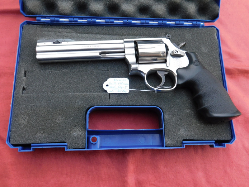 Revolver von S&W Modell 686-5 im Kal. 357 Mag. 4 fach verstellbares Korn, 6 Schuss Trommel, verstellbare Visierung, L Rahmen, sehr schöne originale S&W Gummigriffschalen, 6 Zoll Lauflänge, Lauf innen spiegelblank und Profil scharf. Timing und Abzug sind super. Die Waffe hat meiner Meinung nach hat die Waffe nur minimale bis leichte Gebrauchsspuren. Keine Magnumrille!!!! Gültiger Beschuss vorhanden.