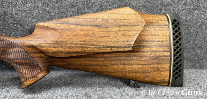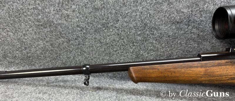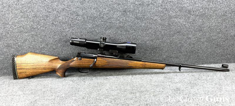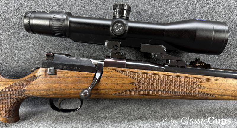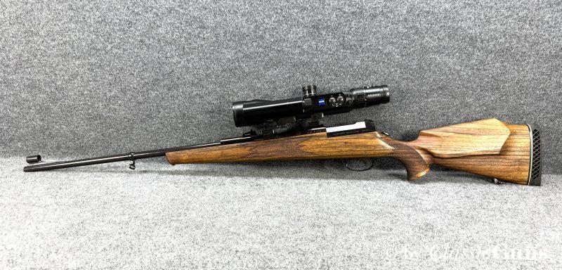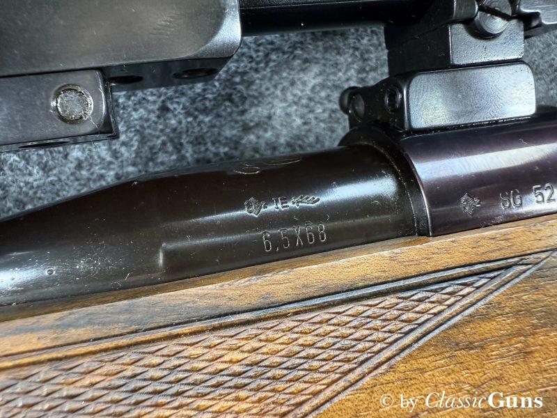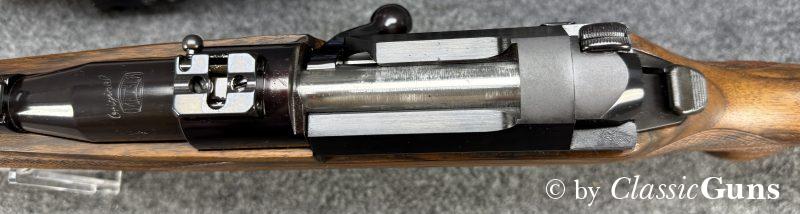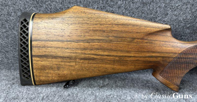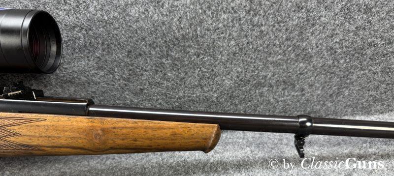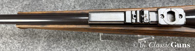 Äußerlich zeigt die Waffe keine nennenswerten Gebrauchsspuren, technisch präsentiert sich die Büchse absolut einwandfrei. Der 670 mm lange Lauf verfügt über ein neuwertig erhaltenes Zug-/ Feldprofil. Der ansprechend gemaserte Nussbaumschaft mit Bayrischer Backe ist frei von Rissen, die Schaftkappe ist unbeschädigt. Die Brünierung der Stahlteile ist sehr gut erhalten, mit minimalen Gebrauchsspuren. Die Büchse verfügt über einen hervorragenden und praxistauglichen Direktabzug.